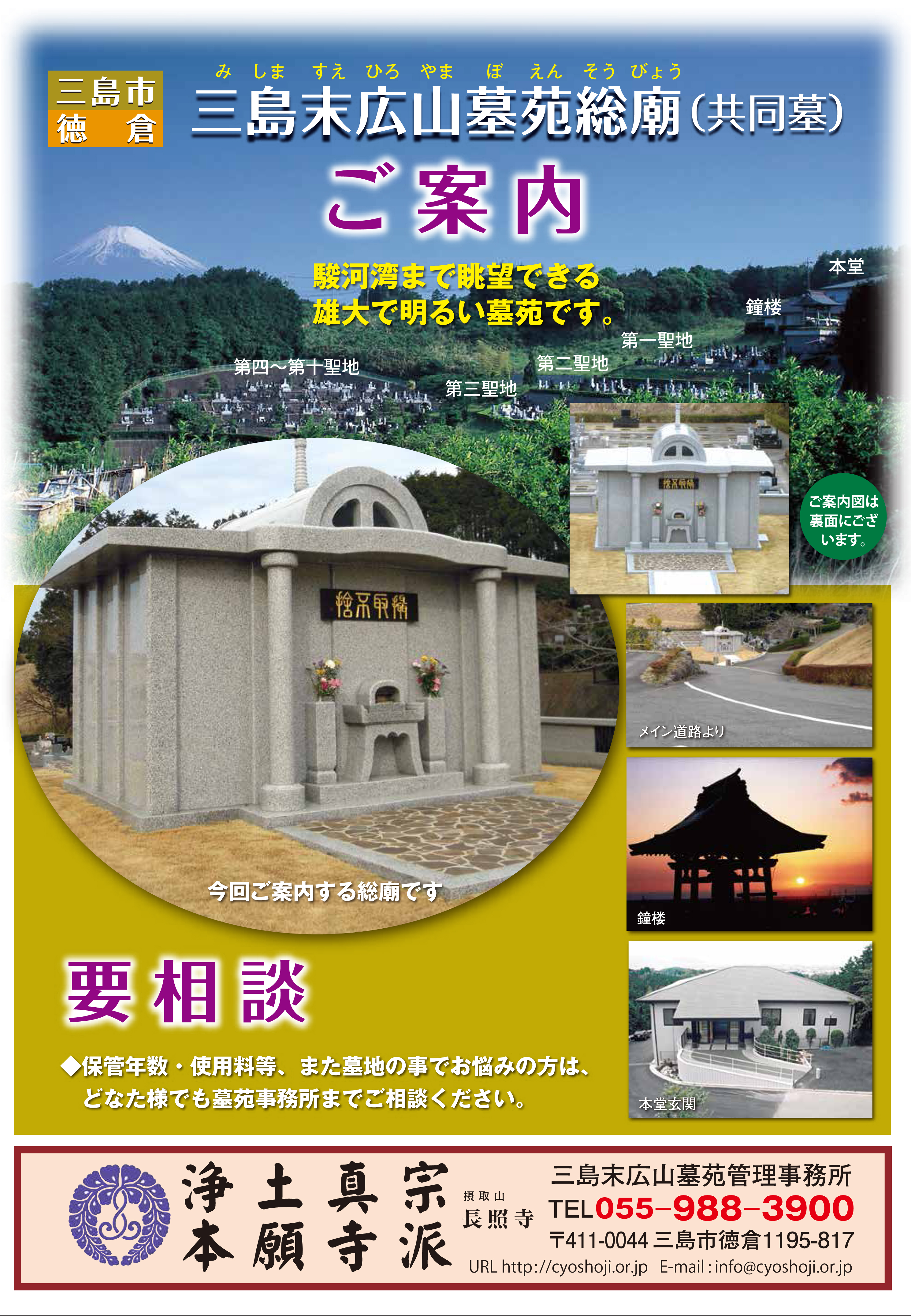 お寺として熟慮した結果、そのような方々の今後のご不安を解消させていただくため、既存の「家族・個人墓」ではなく、「総廟(共同墓)」においてご遺骨を納骨し、お寺が永代追悼(供養)してはいかがかとの思いにいたり、このたび三島末広山墓苑内(長照寺墓地)において、『三島末広山墓苑総廟(共同墓)』を建立いたしました。